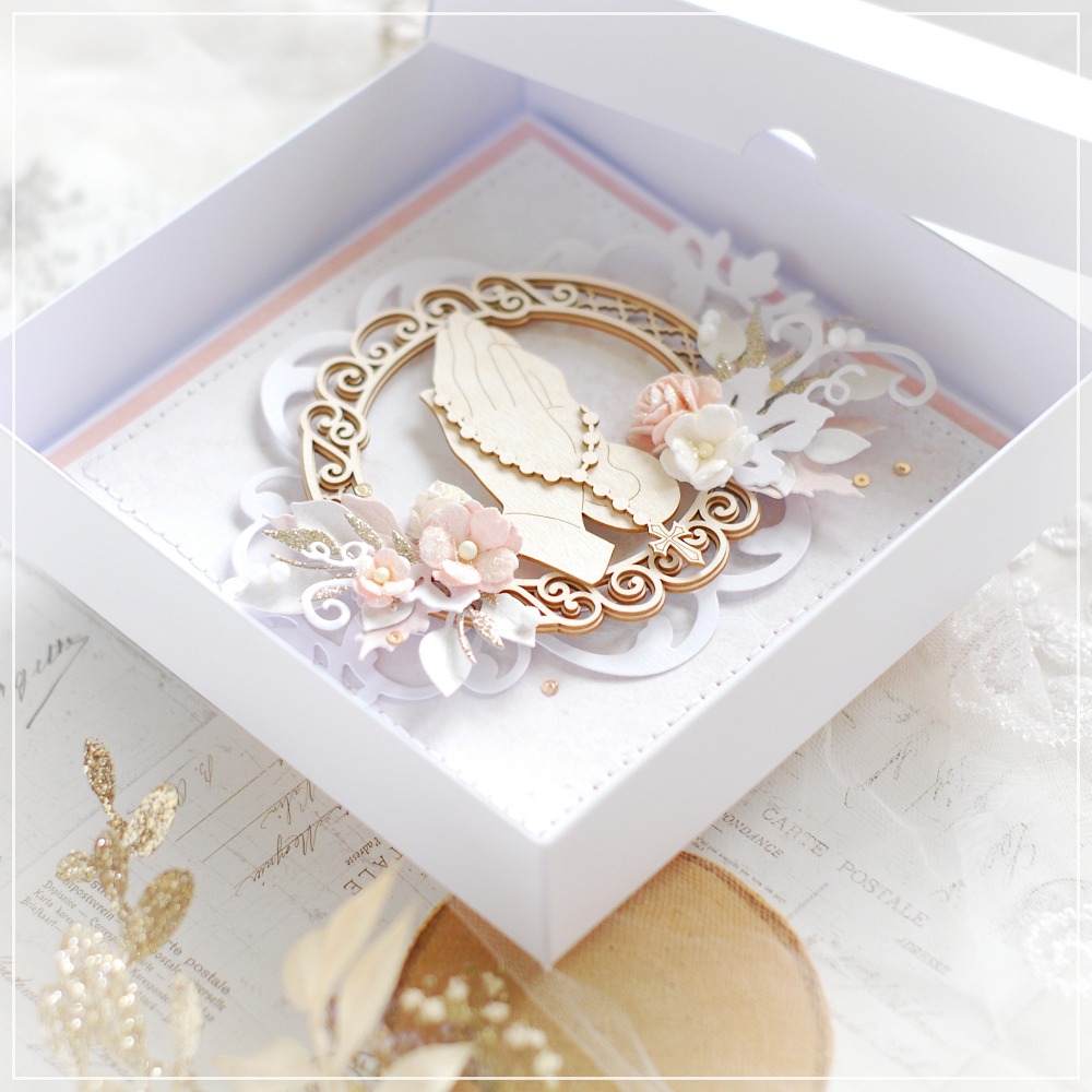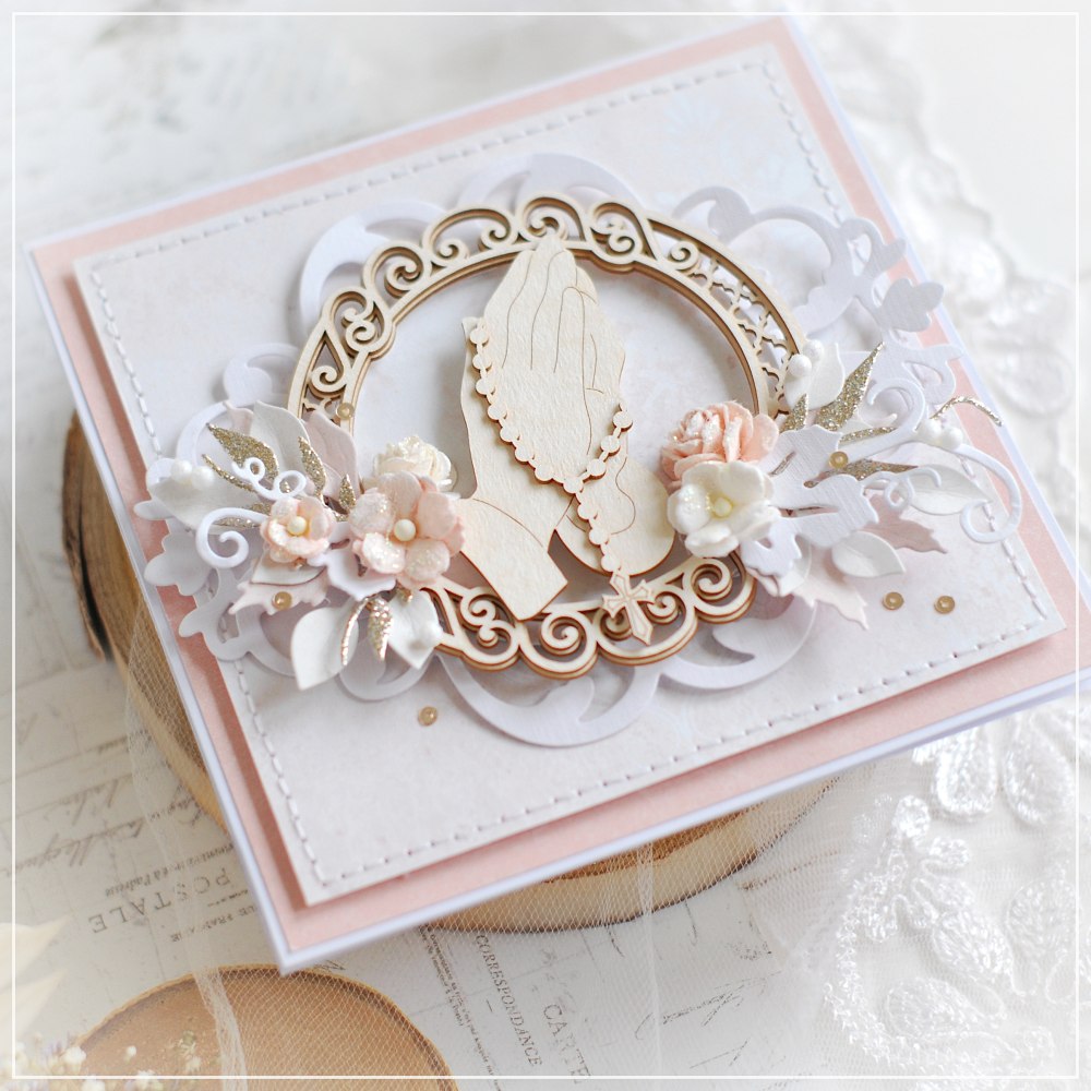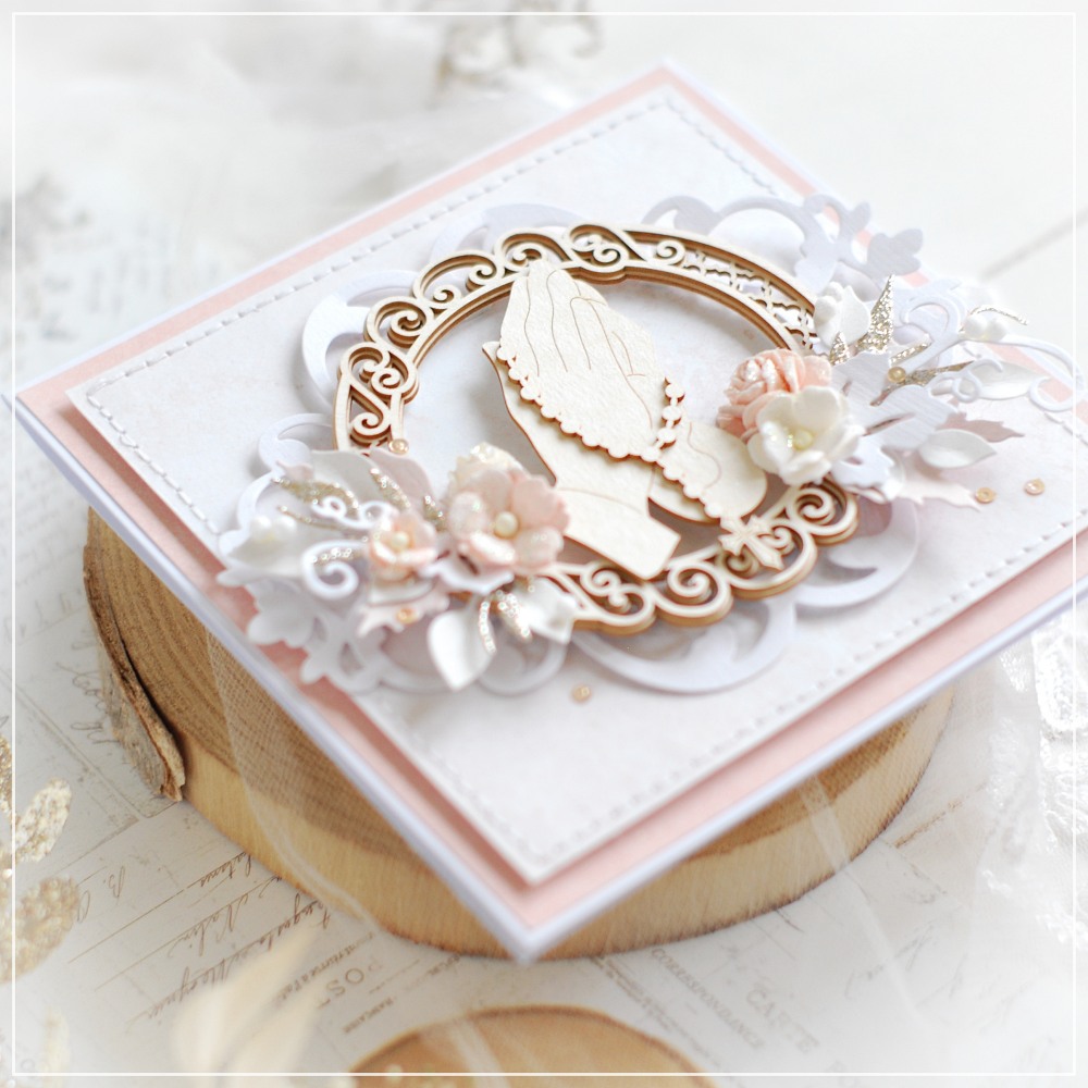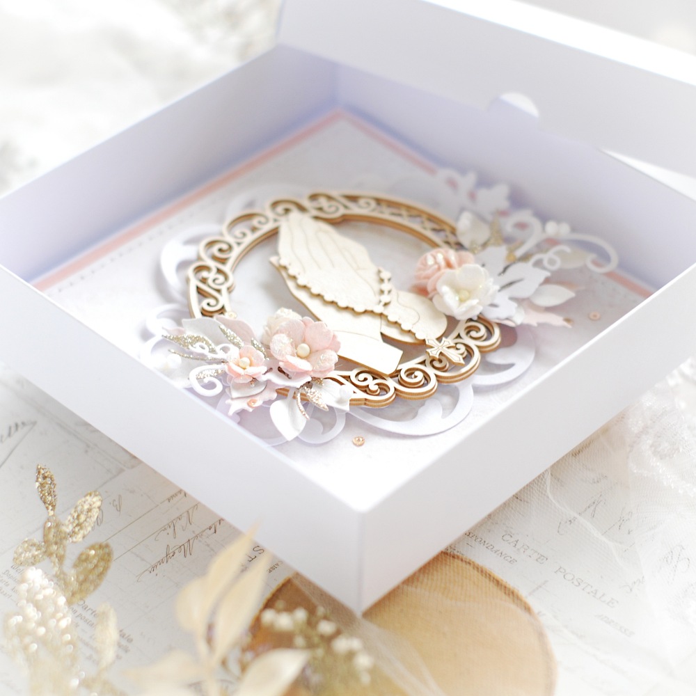 At the centre , a stunning layered frame made from high-quality chipboard highlights delicate laser-cut details of praying hands holding a rosary. The designs is completed with a graceful floral arrangement, creating a harmonious and sophisticated look.