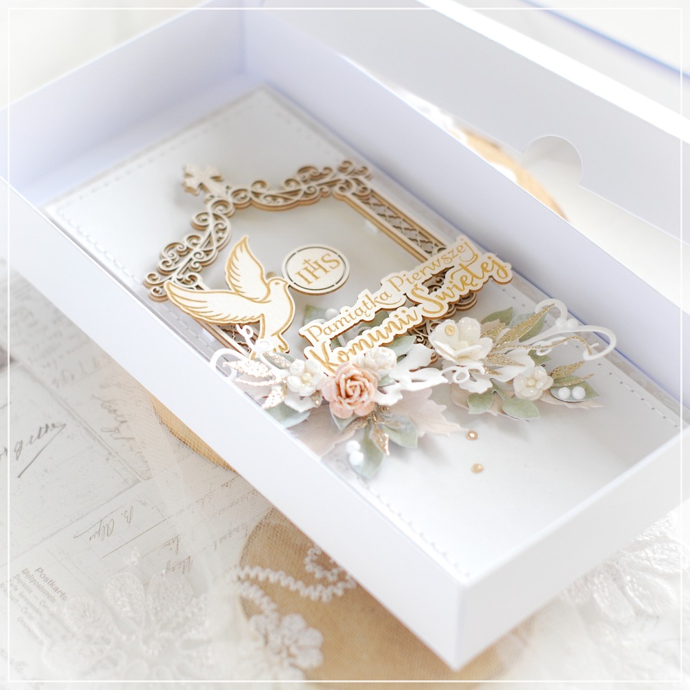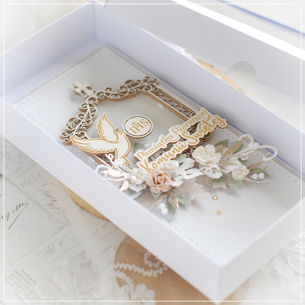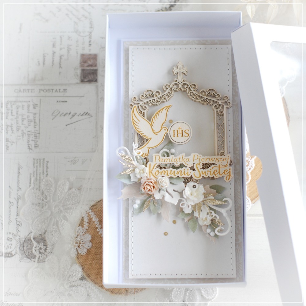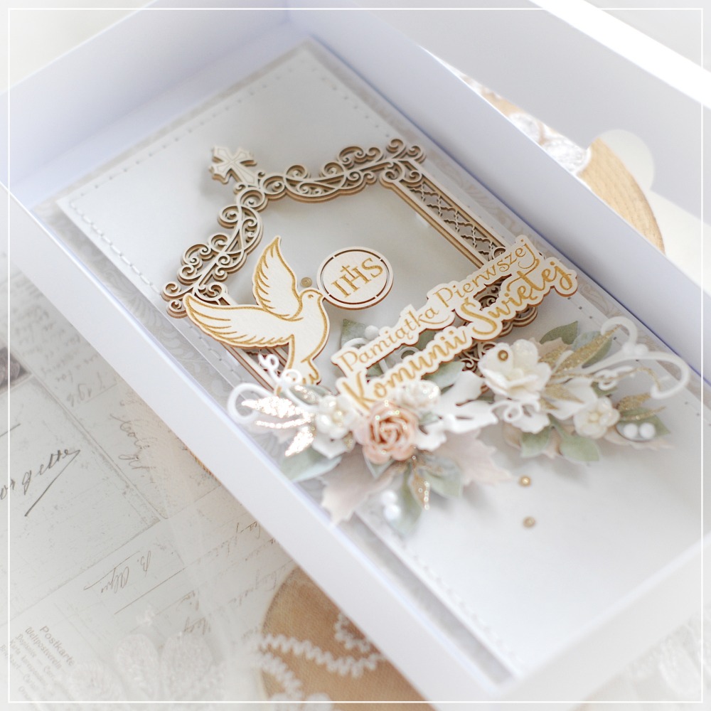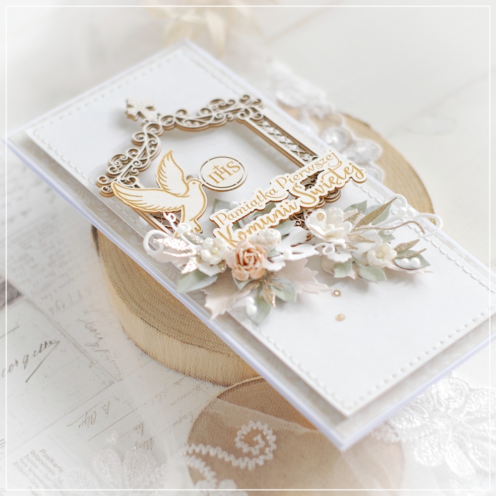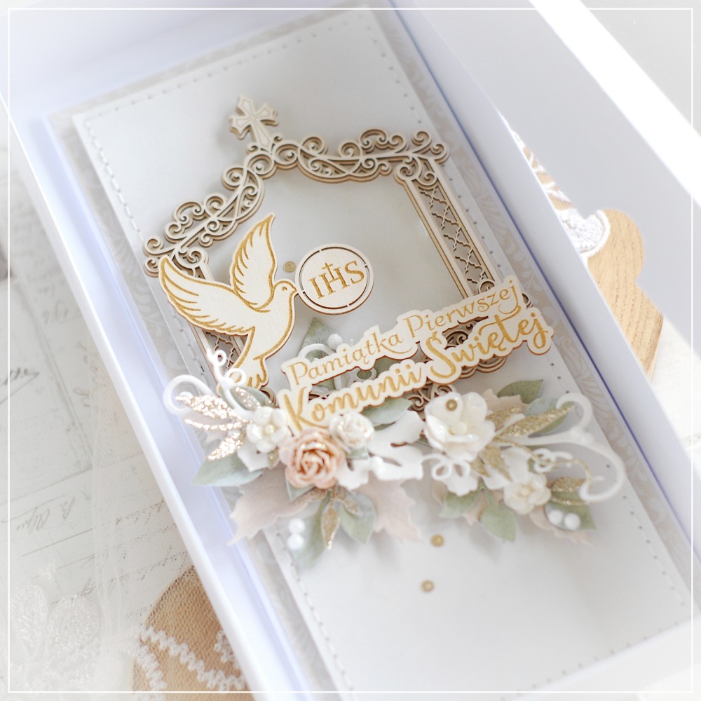 The front of the card is carefully hand-stitched, adding a unique artisanal touch. It is beautifully decorated with layered chipboard frame, featuring an engraved dove with “IHS” symbol and inscription ” Pamiątka Pierwszej Komunii świętej ” ( First Holy Communion Keepsake ) in Polish .