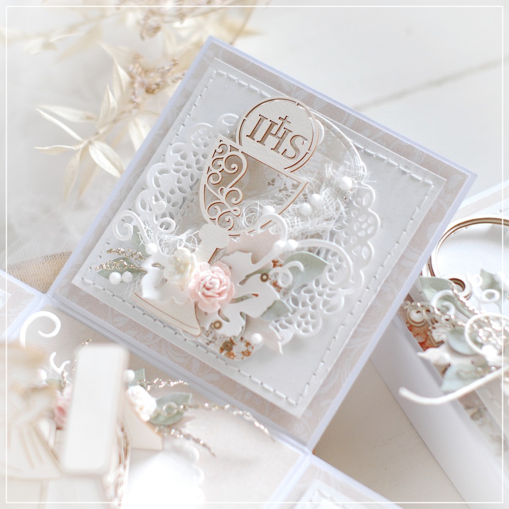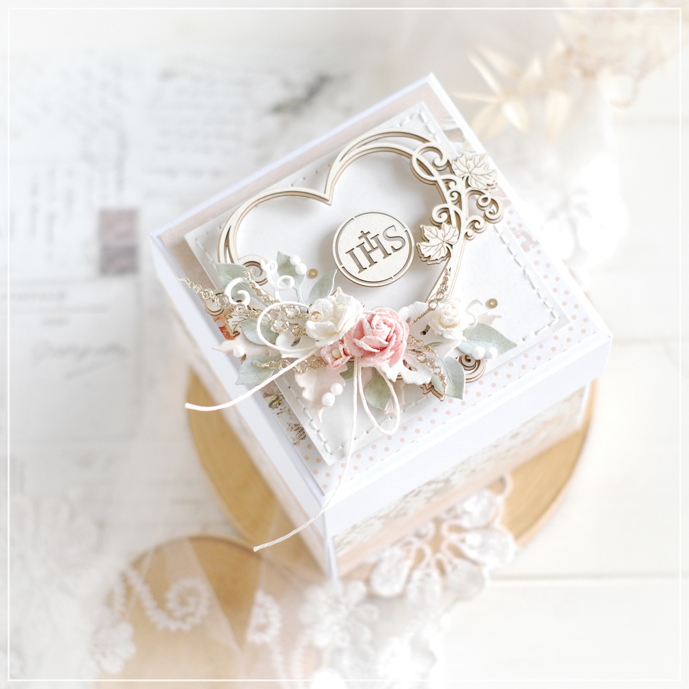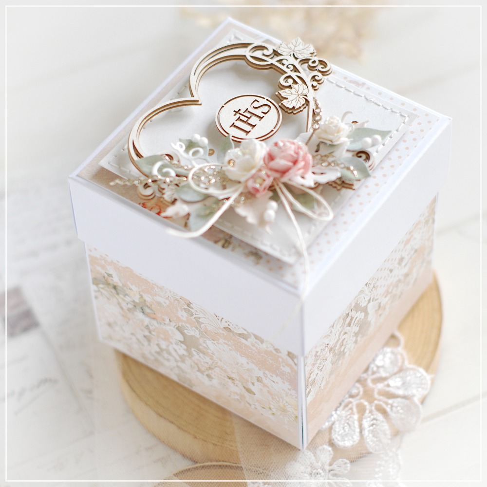 The lid is elegantly decorated with a layered chipboard frame in the shape of a heart, complemented by a symbolic host and a refined floral arrangement, giving the box a timeless and ceremonial character.