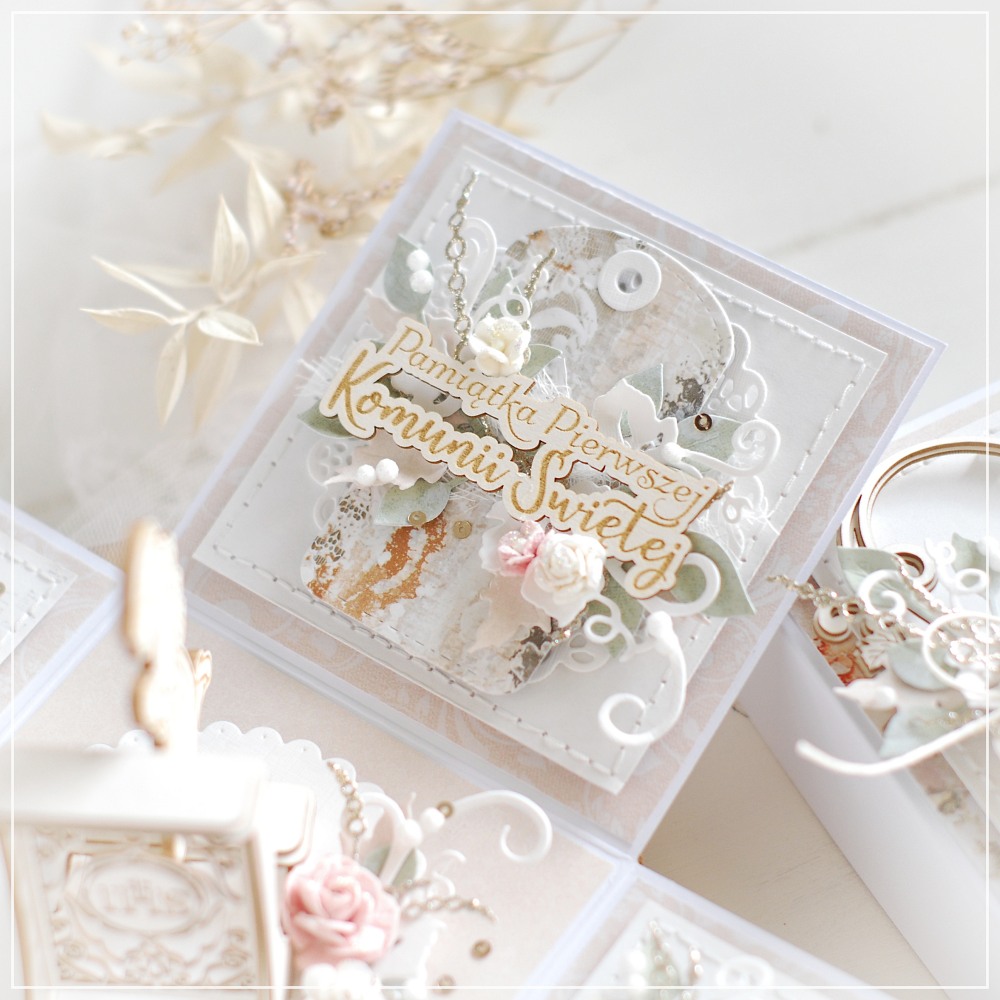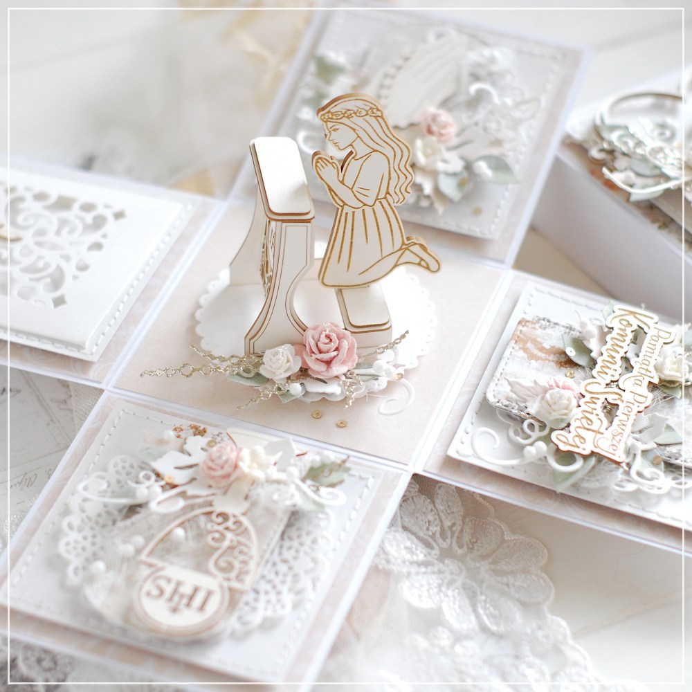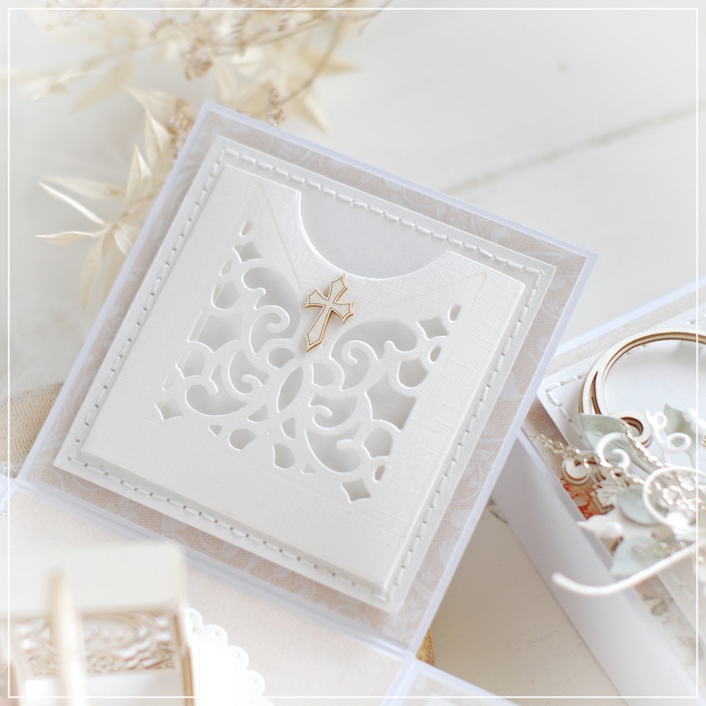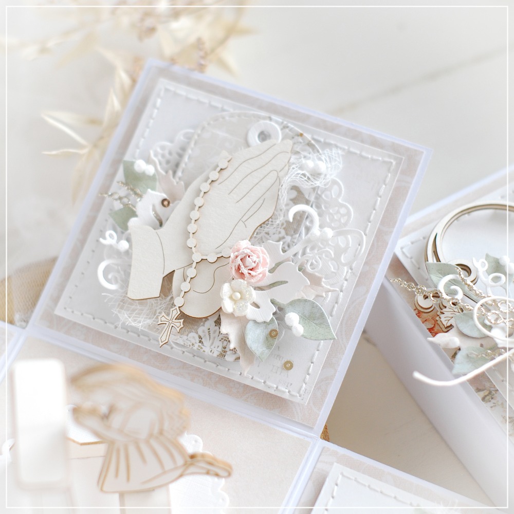 The lid is elegantly decorated with a layered chipboard frame in the shape of a heart, complemented by a symbolic host and a refined floral arrangement, giving the box a timeless and ceremonial character.